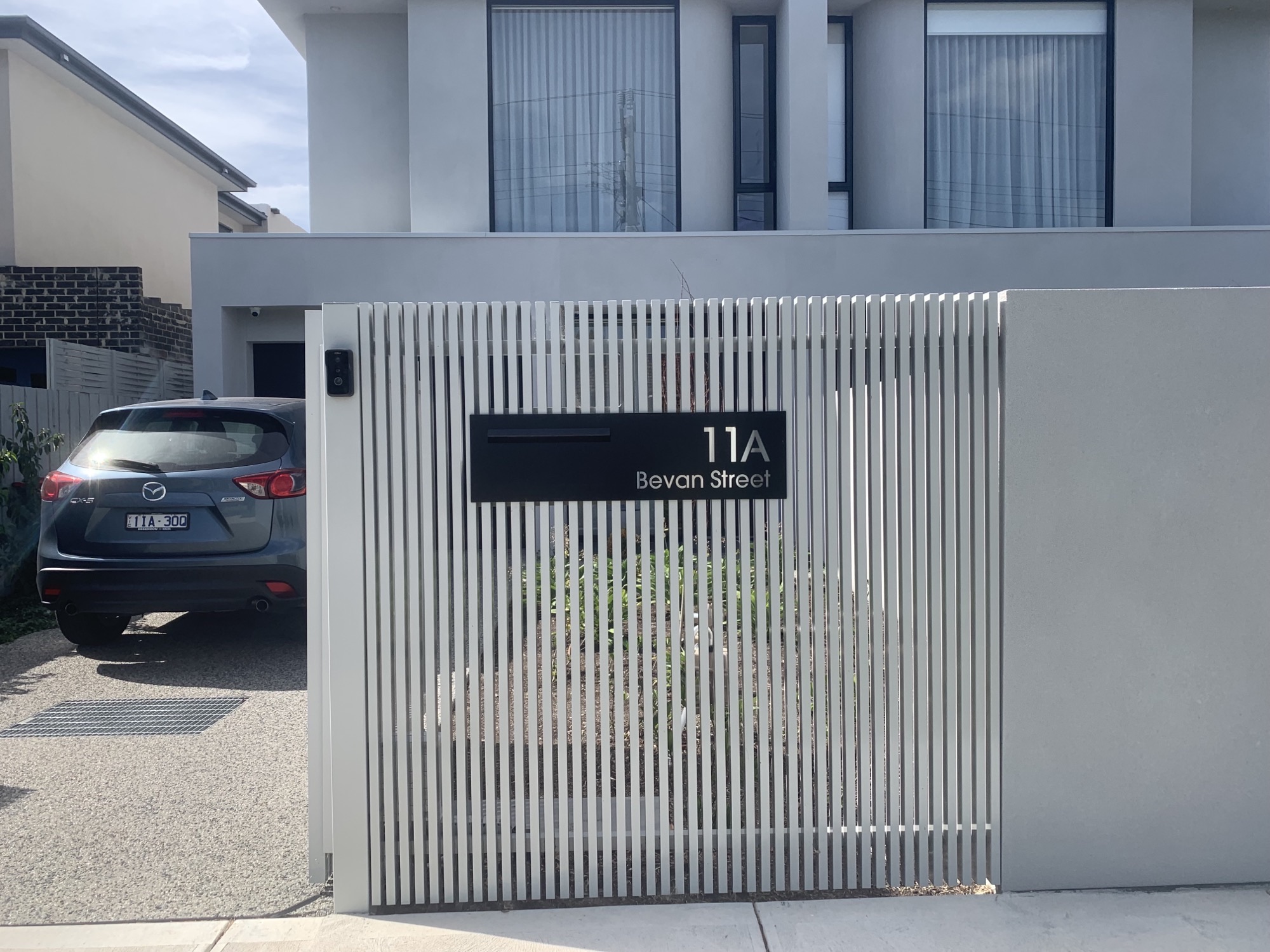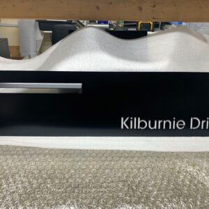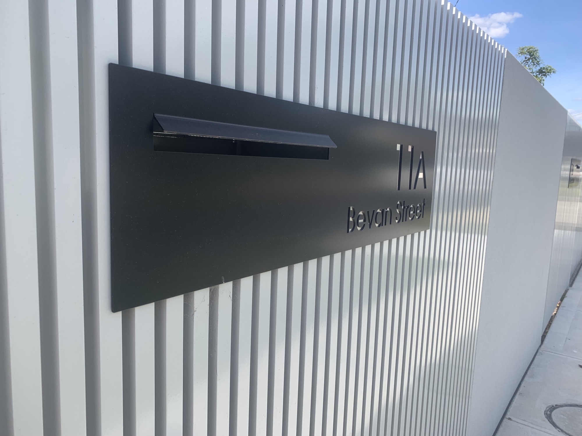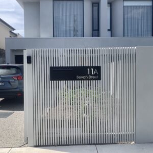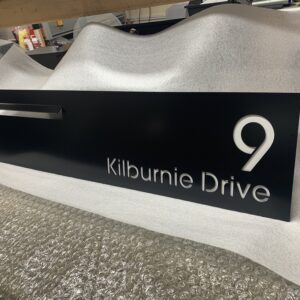 The BLACK ATKINSON Right hand has your NUMBER & ADDRESS Laser cut on the RIGHTHAND SIDE of the panel with a standard white or optional stainless steel backing to highlight the text.