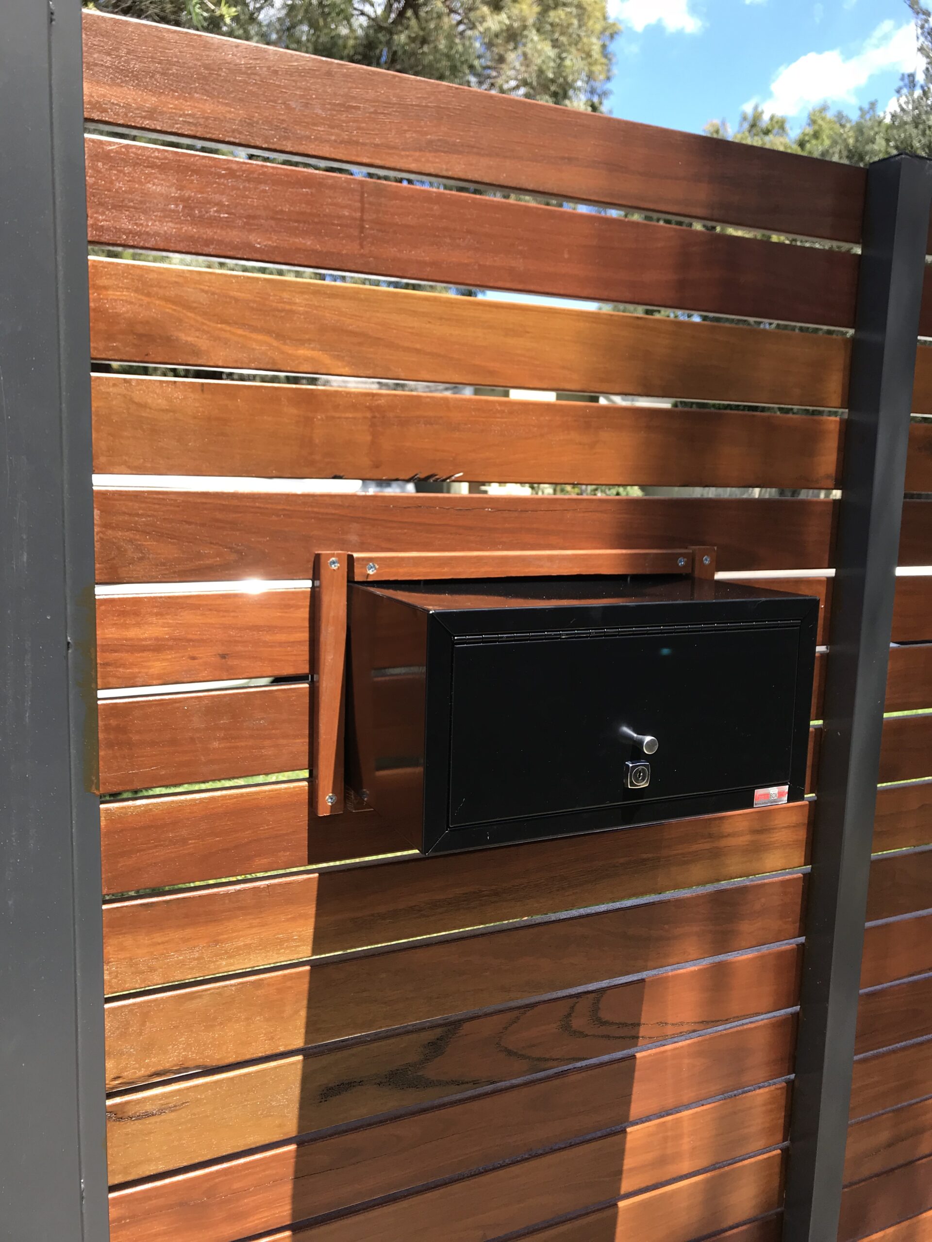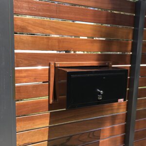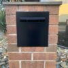 The BLACK Atkinson Letterbox is a large modern rectangle face panel accepting A4 mail with ease. Using Stainless Steel for the face panel and housing insert they are the powdercoated with Dulux Duralloy Matt Black Powdercoat with a White or optional Stainless steel backing panel to hihlight the text. The face panel attaches to the secure housing insert after your brickwork is acid washed, rendered or installed into a timber or metal fence with internal concealed fixings but will also require some glue fixing to the overhang to mount in place.