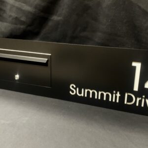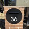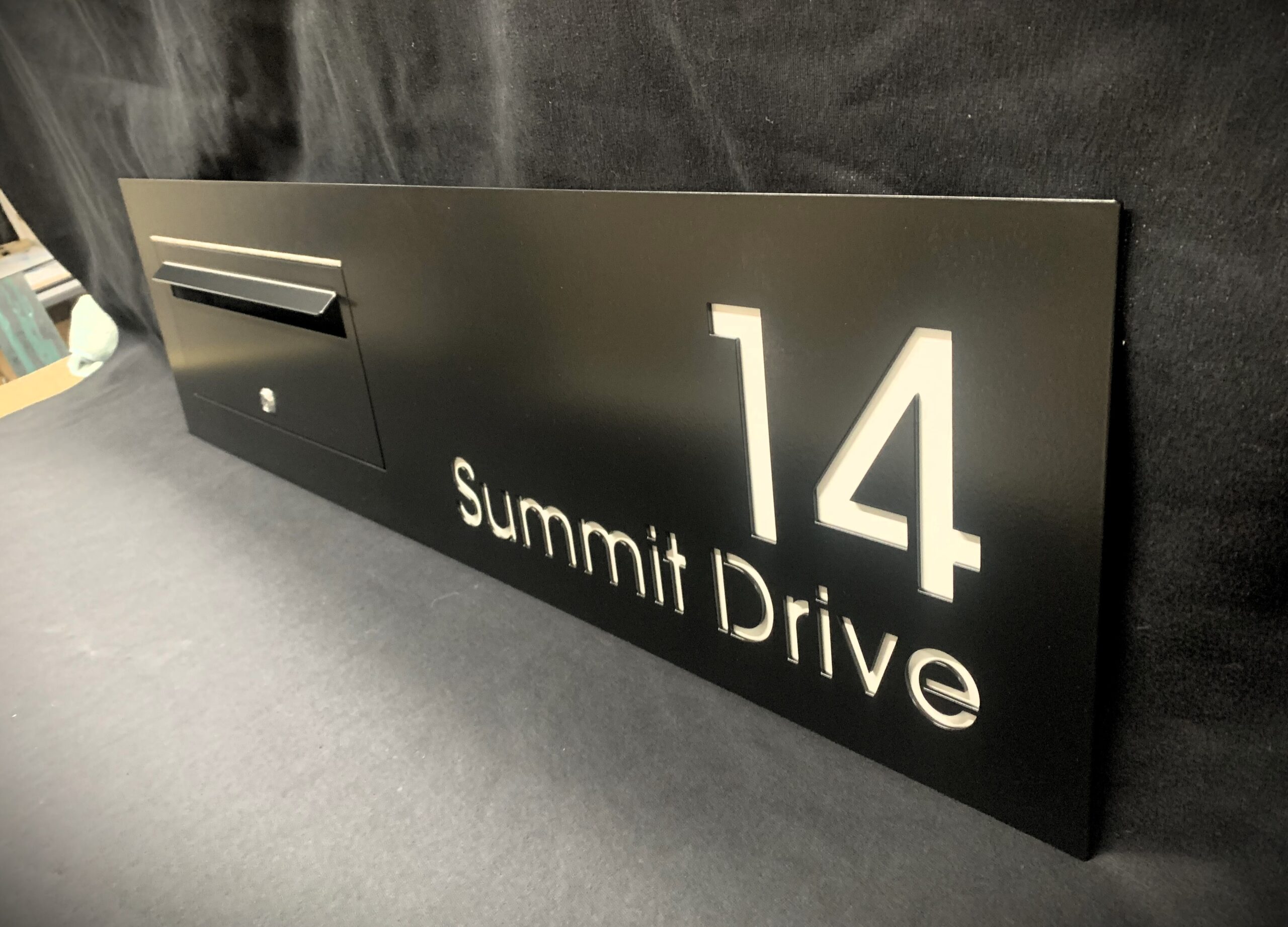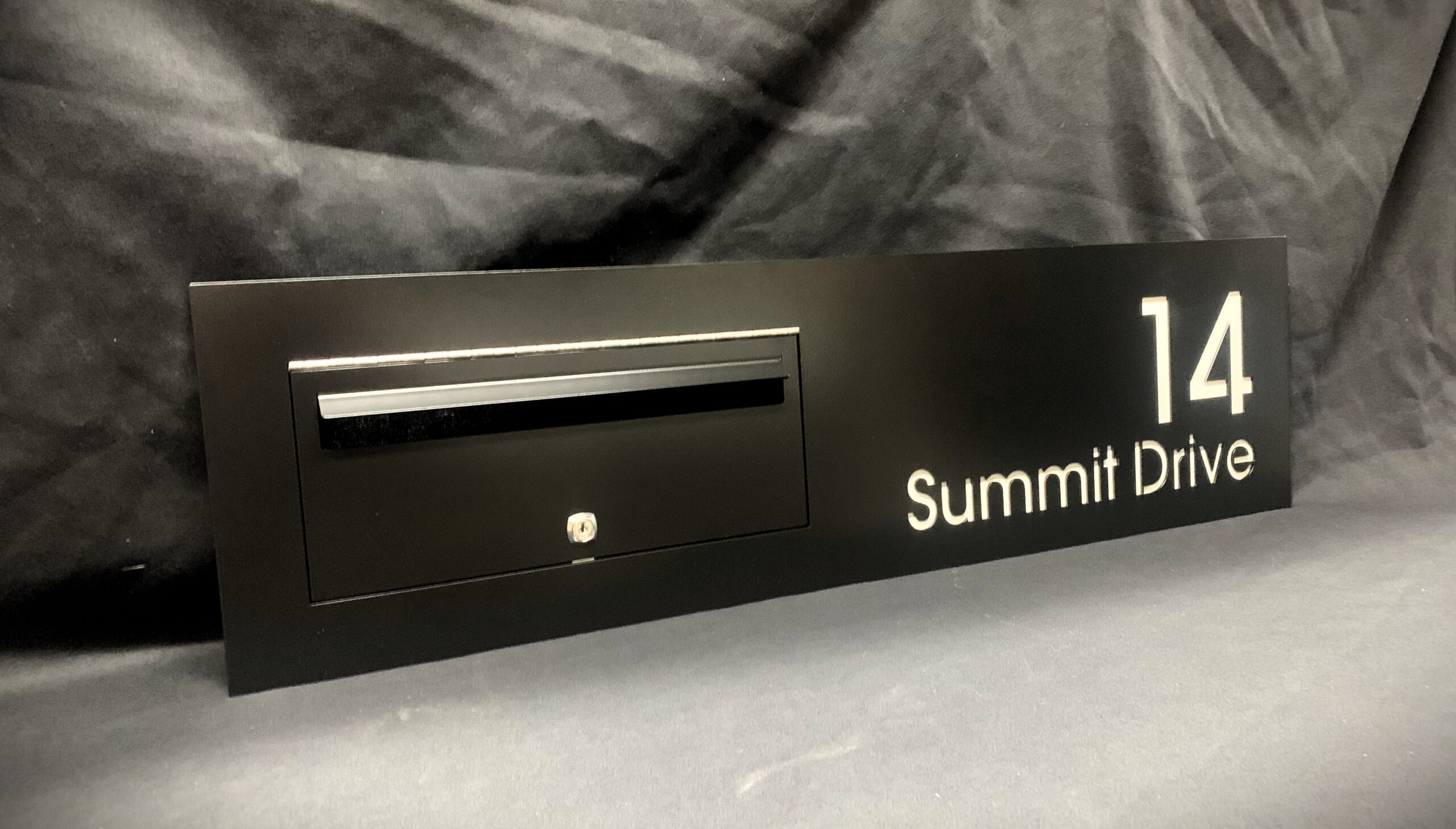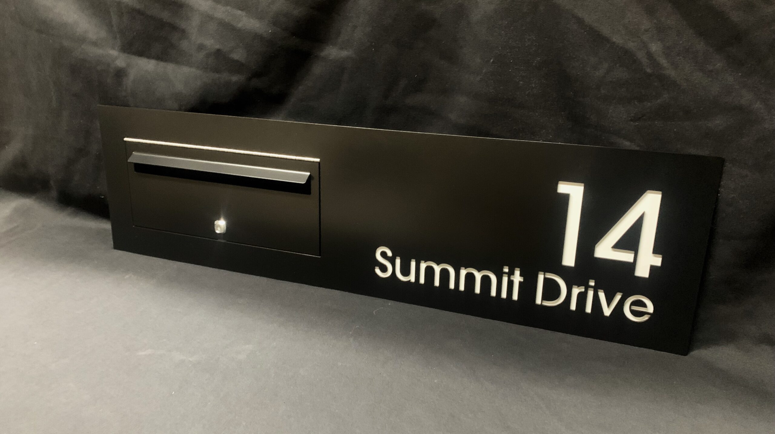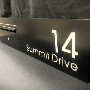 The ATKINSON Front Accessible Letterbox has your NUMBER & ADDRESS Laser cut on the RIGHT or LEFT hand side of the panel with a black, white or stainless steel backing to highlight the text.