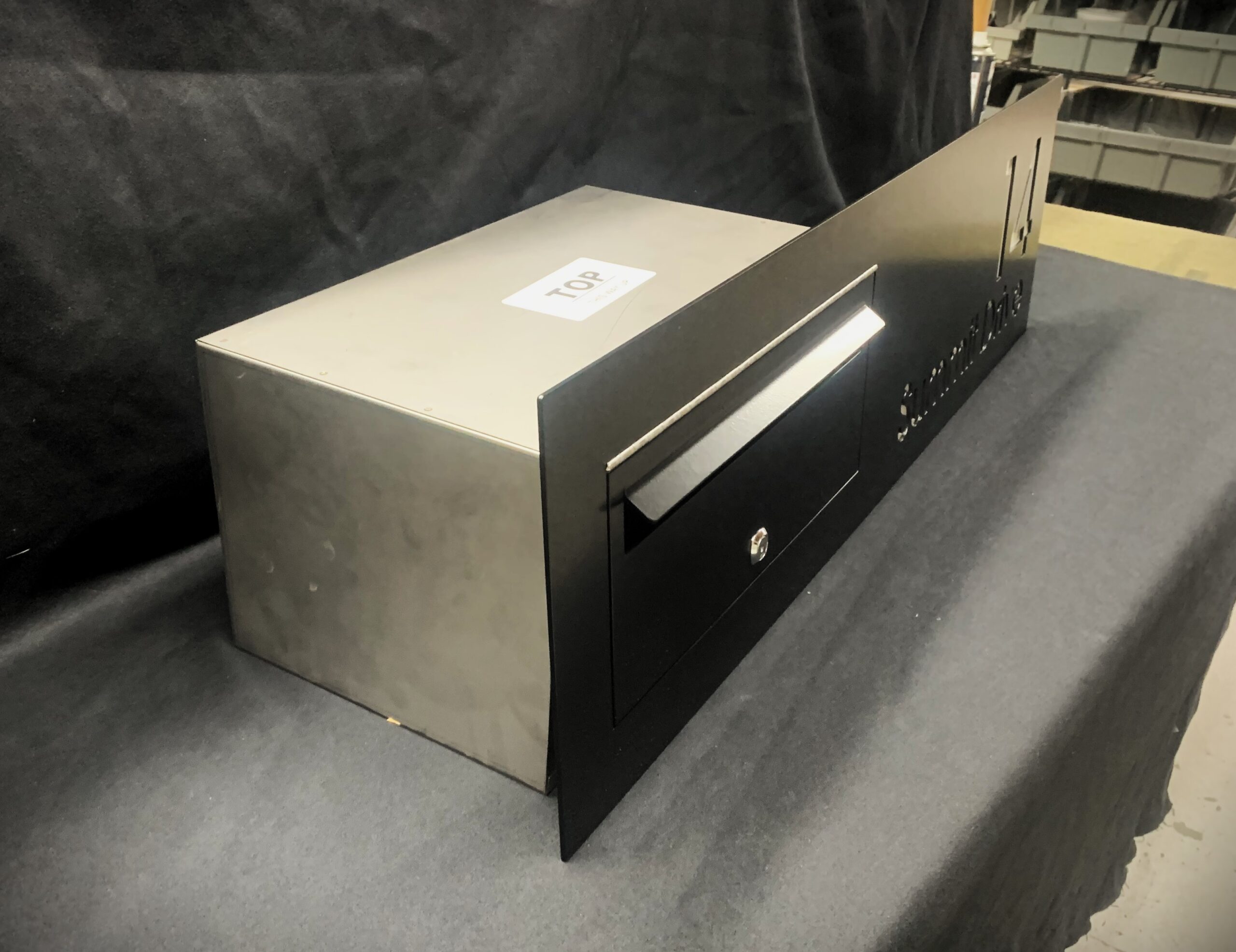 The ATKINSON Front Accessible Letterbox is a large modern rectangle face panel accepting A4 mail with ease. Using Stainless Steel or Powdercoated stainless steel finishes for the face panel with your Street Address laser cut to the Left or Righthand sides of the face panel. The face panel attaches to the secure housing insert after your brickwork is acid washed, rendered or installed into a timber or metal fence with internal concealed fixings but will also require some glue fixing to the overhang to mount in place.